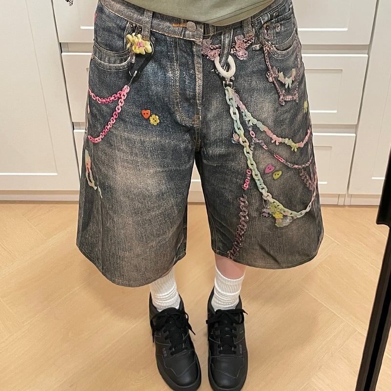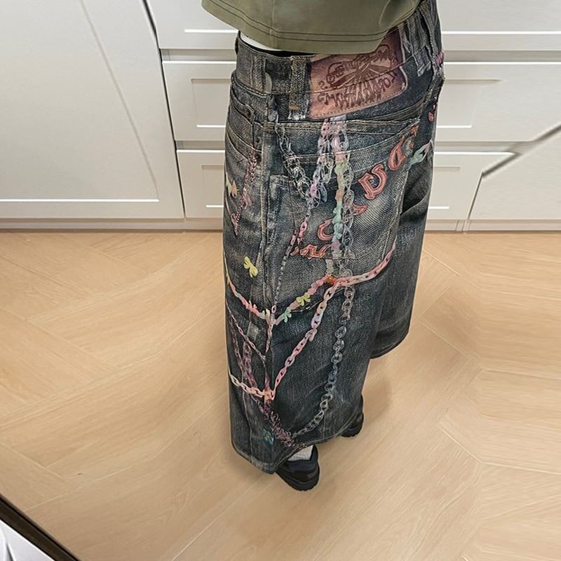 MMBBTウォレットチェーン落書きクロップトデニムパンツ