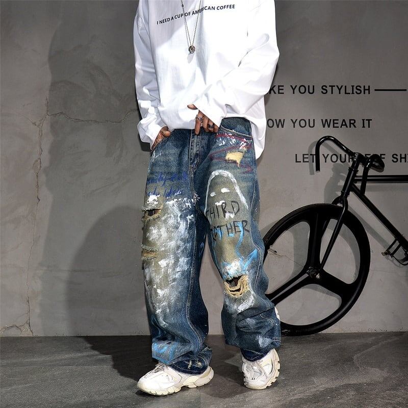 グラフィティ描くダメージ加工デニムワイドパンツ