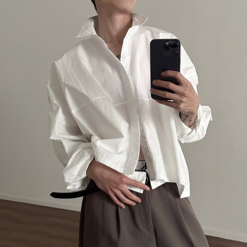 VERY FEWESTブルーストライプショート丈長袖シャツ