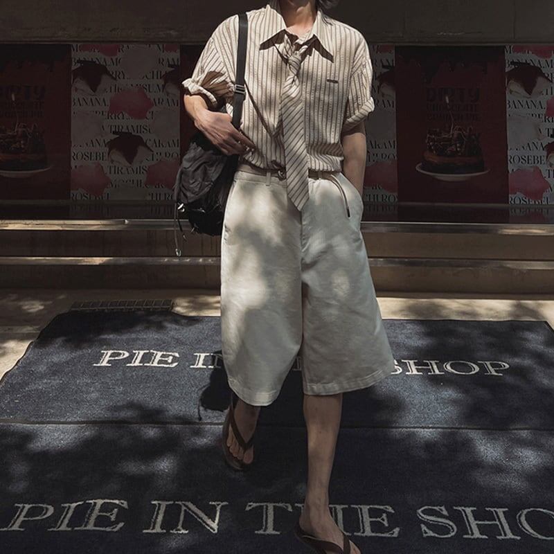 薄手ストライプ柄ネクタイ付き半袖シャツ